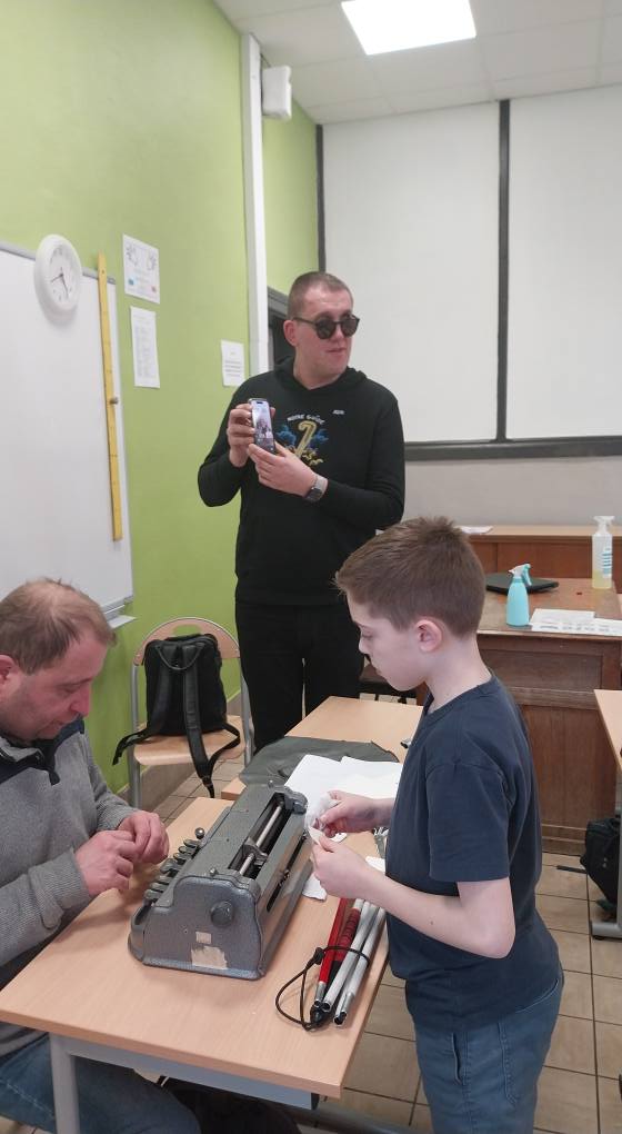 Les élèves ont pu vivre en direct la situation de ces personnes et leur poser toutes les questions sur leur quotidien et ces difficultés. (écriture en braille, utilisation d un téléphone, ordinateur…et parcours à l’aveugle).